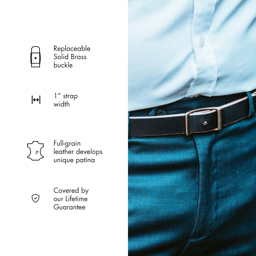 Meet our Conway Belt, similar to our Dress Belt but with a cool twist. It uses a Conway buckle, which means no need for a keeper, giving it a sleek look. This belt lets you choose how to wear it: you can show off all the belt holes or none, making it super versatile for any outfit.