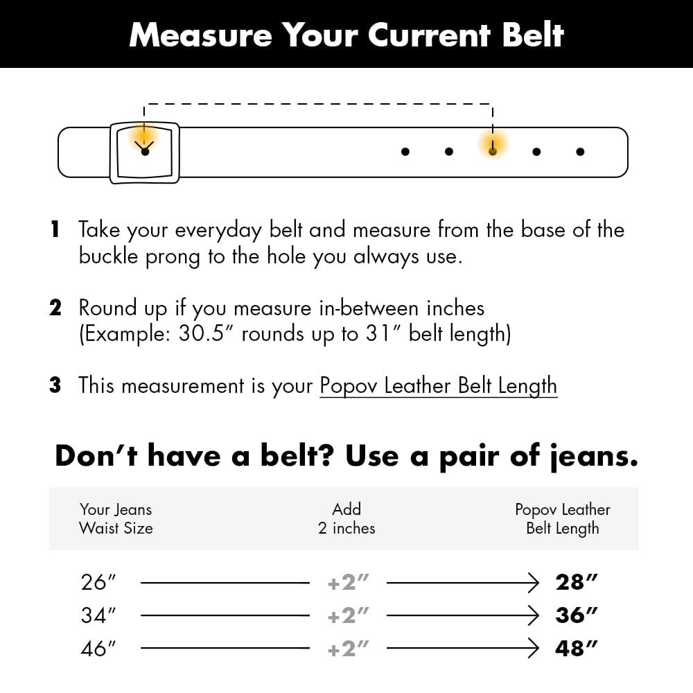 Please Note: For a perfect fit, measure the belt you wear now. Use our belt sizing guide to help you. If you don't have a belt to measure, use your favorite pair of jeans and add 2" to their waist size.